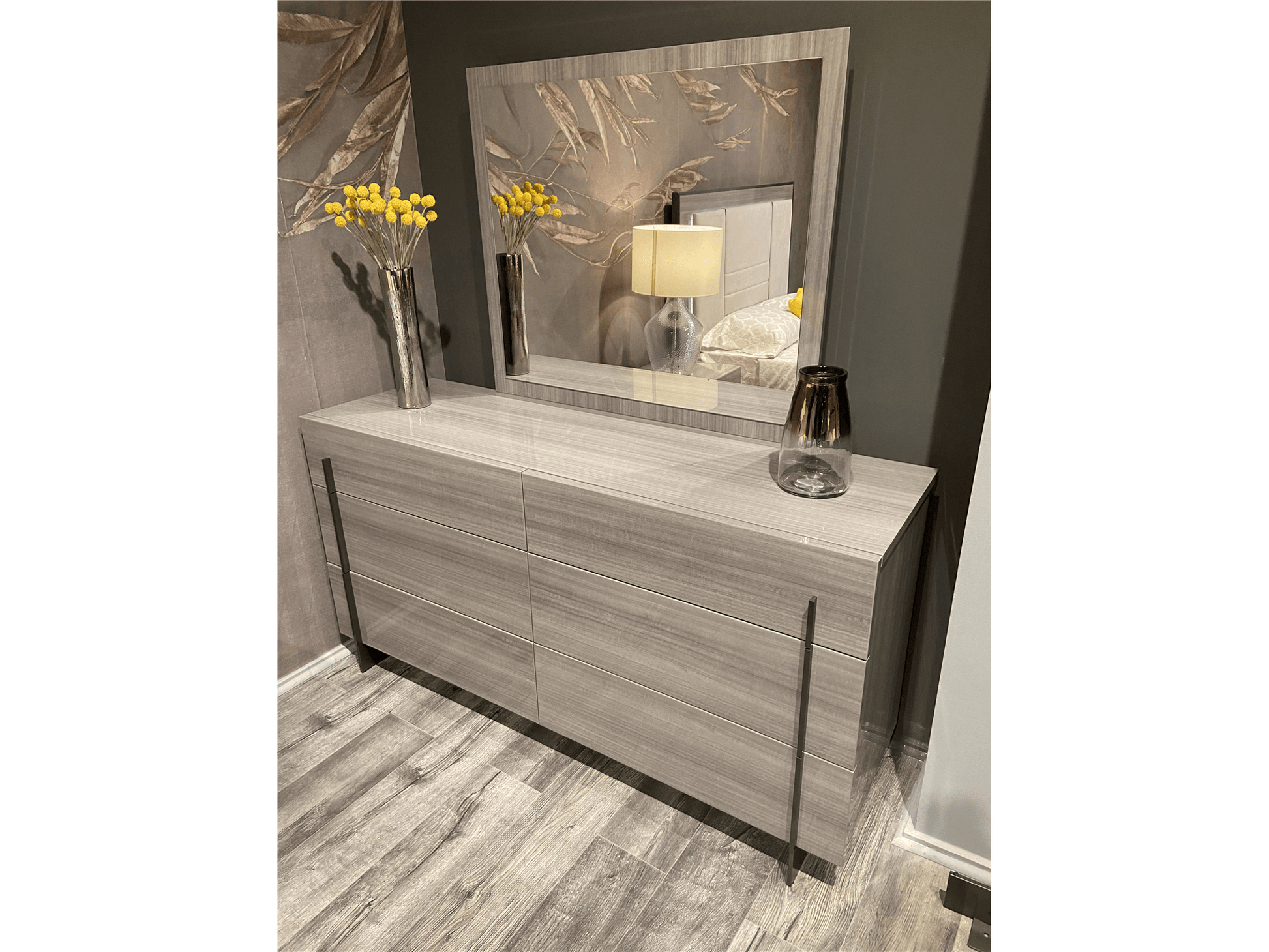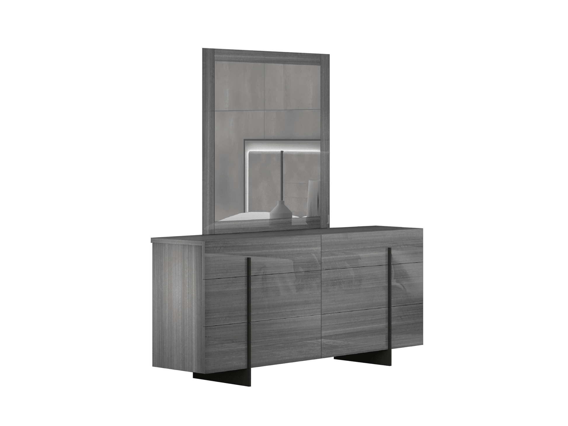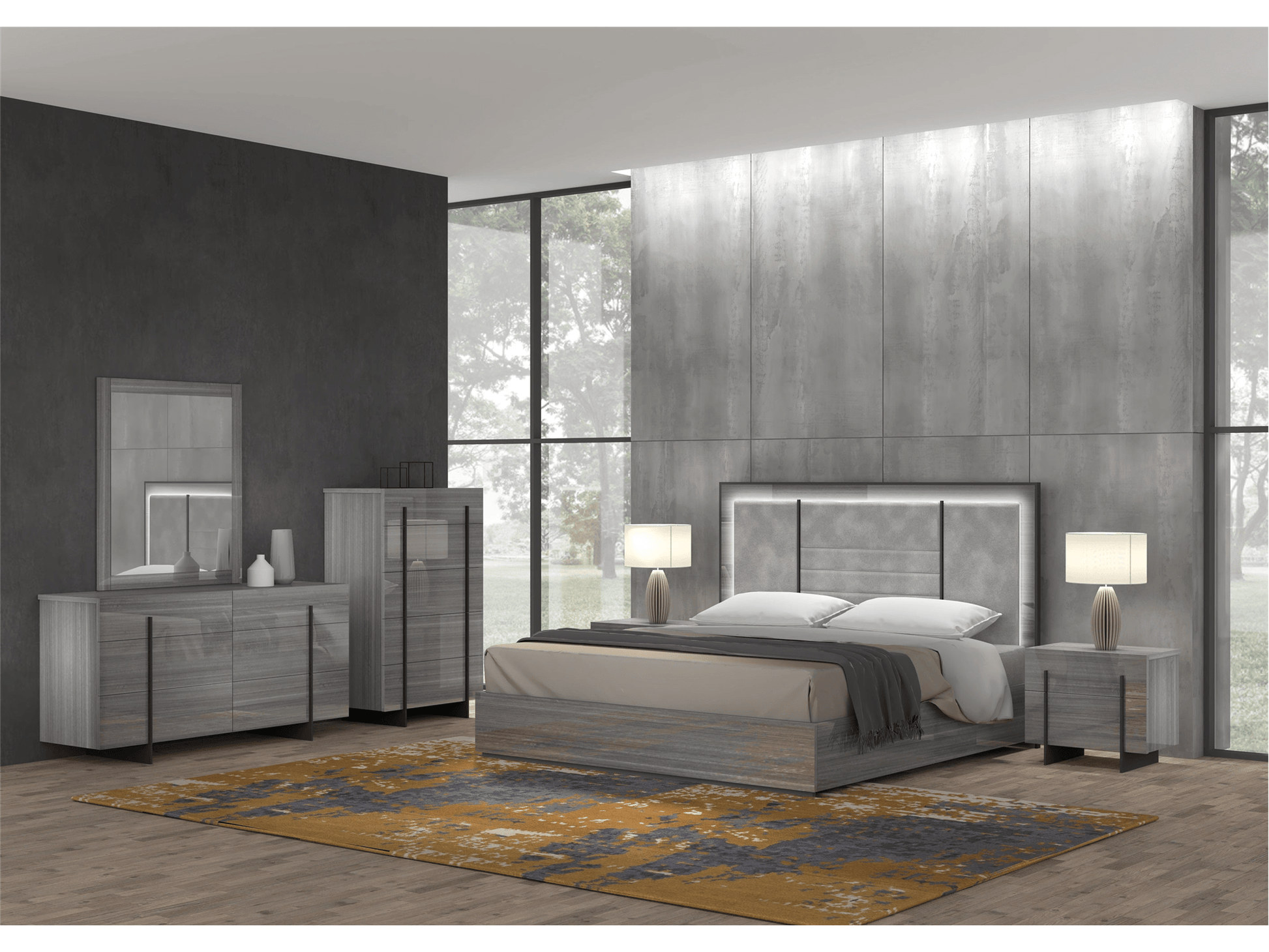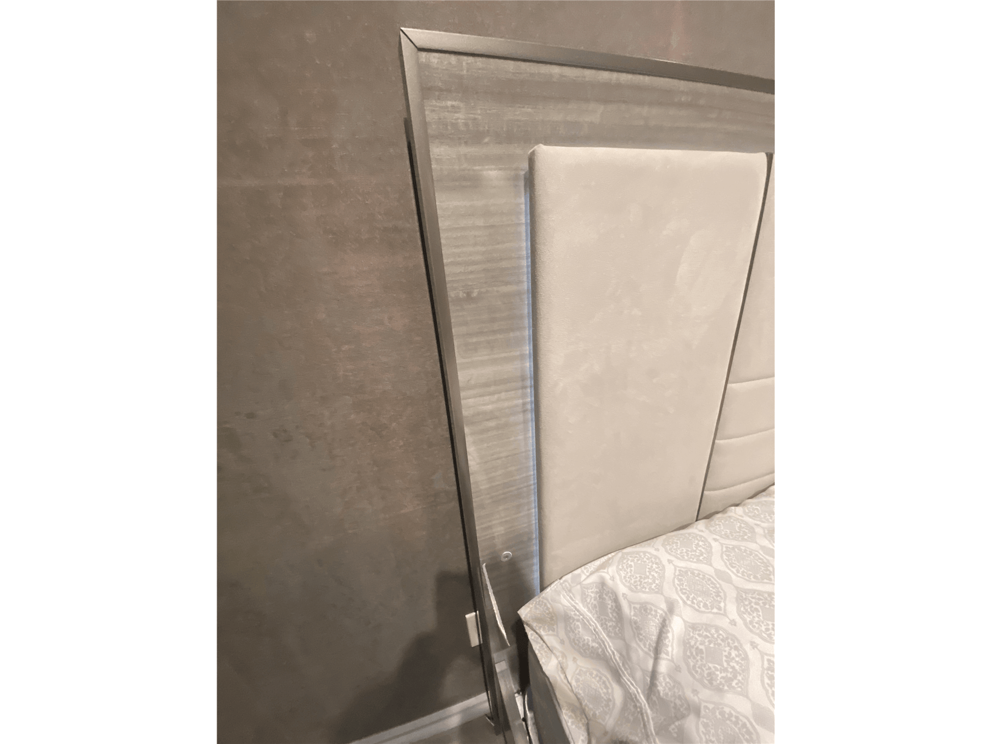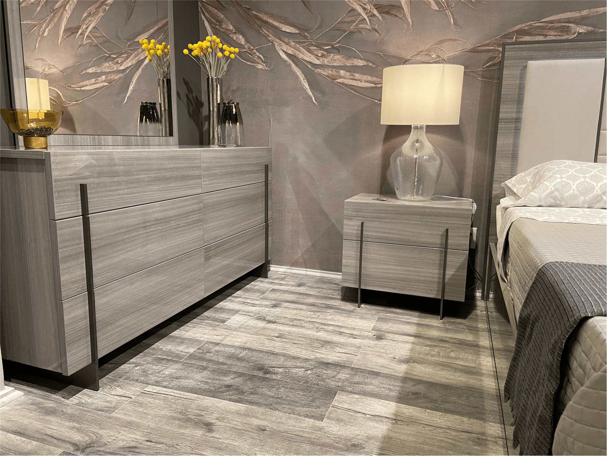 La collezione Blake Bedroom presenta un design innovativo e lussuoso, creato dalle "lame" metalliche che partono da sotto i mobili e si estendono fino alla parte anteriore, fungendo da maniglia per i cassetti. Il design è replicato sulla testiera, dove due barre metalliche affondano in un pannello rivestito in velluto. Nascosta dietro i bordi del pannello, una striscia di luci a LED funge da luci di cortesia, azionate da interruttori invisibili situati su ciascun lato della testiera. Questi pannelli presentano strisce nere effetto eucalipto su una superficie grigia con finitura lucida. Questo sofisticato design moderno-industriale è un'ottima aggiunta all'arredamento della vostra casa.