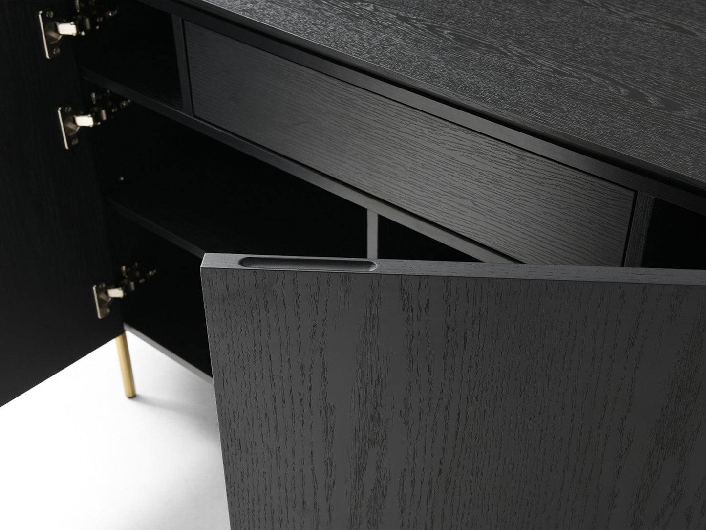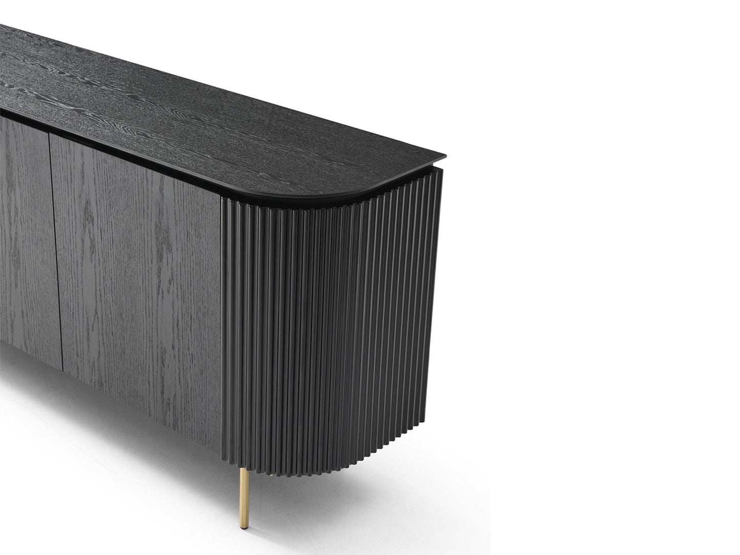 Buffet Gloria in rovere nero, con pannelli terminali a coste in nero opaco, un cassetto interno, senza maniglie e base in oro spazzolato.