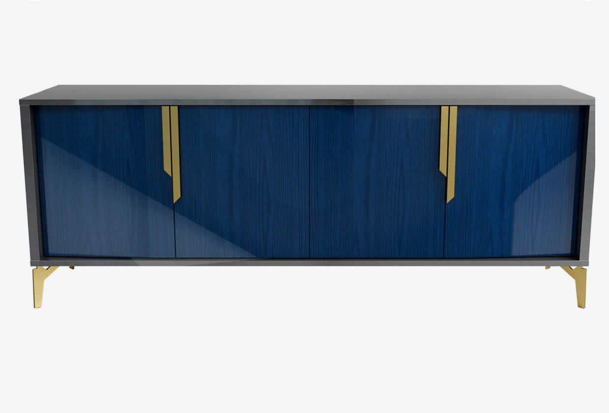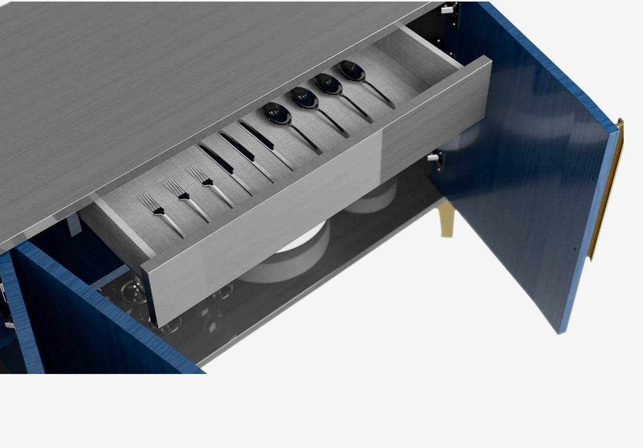 Nel NUM BUFFET le tonalità cobalto del legno si sposano perfettamente con la finitura spazzolata delle parti metalliche.