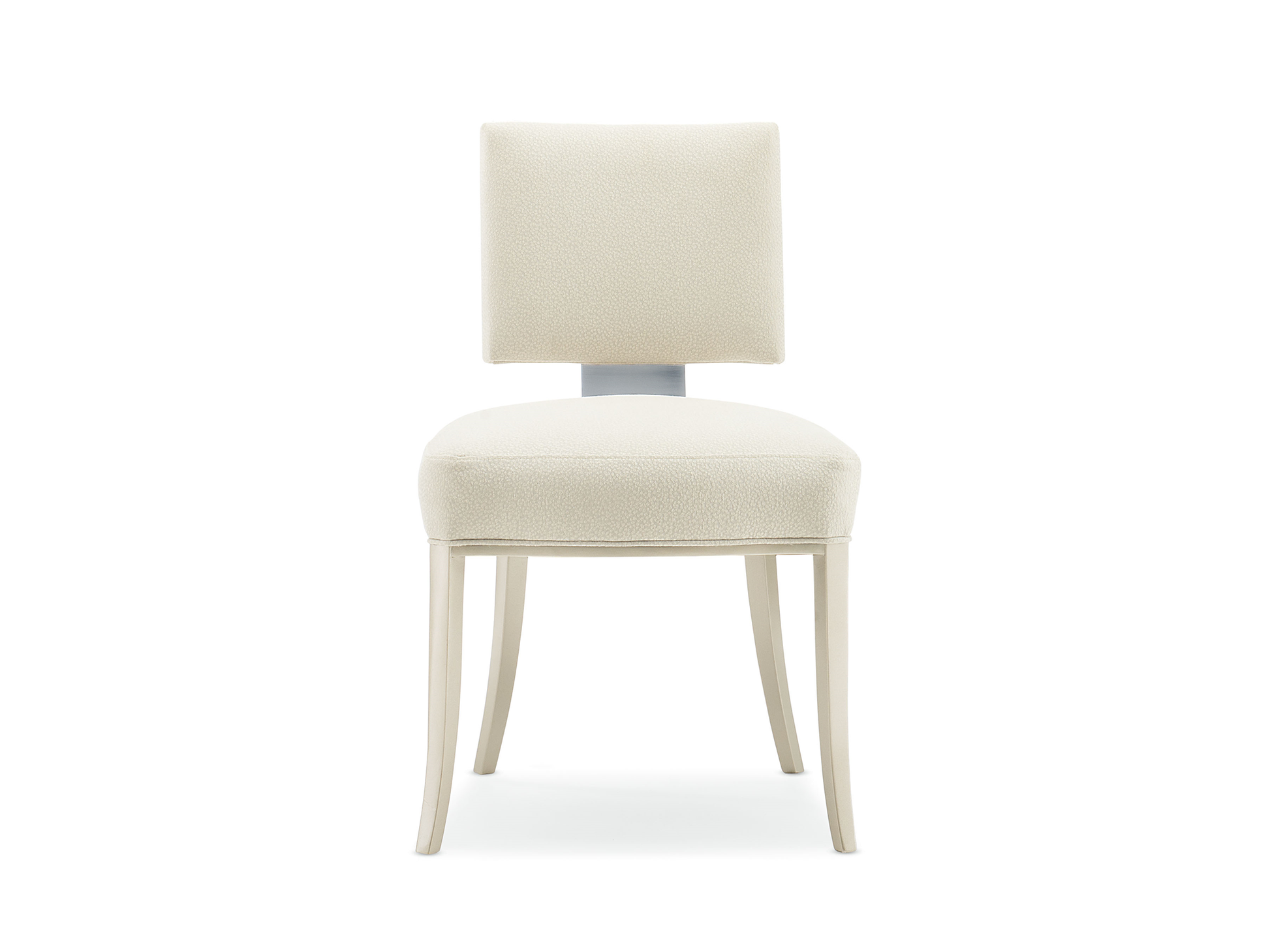 Per una nuova interpretazione di una sedia klismos bassa e moderna, questa silhouette assume uno stile scenografico quando si osserva l'ampio pannello che ne valorizza lo schienale. Un tessuto satinato neutro con un delicato motivo moiré avvolge completamente la parte superiore quadrata dello schienale e il cuscino della seduta, che poggiano su una struttura in legno a vista e gambe a sciabola con finitura Seal Skin. Questa è una sedia dal fascino davvero raffinato.