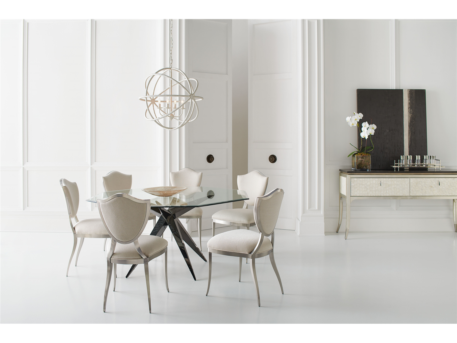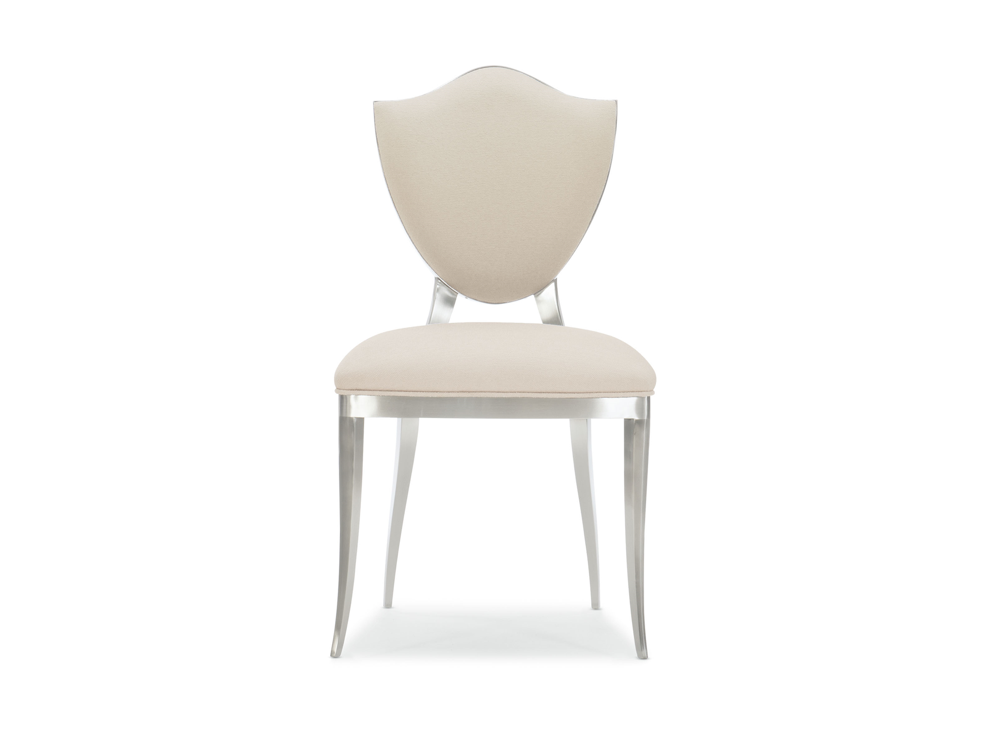 Ispirata alla classica forma a scudo, la sedia da pranzo Shield Me porta un tocco di tradizione rivisitata nella zona pranzo. Perfetta per un tavolo da pranzo di tendenza, questa sedia distintiva offre una seduta e uno schienale imbottiti e morbidi per favorire piacevoli conversazioni dopo cena. Una finitura cromata leggermente spazzolata, delicatamente riflettente, ne esalta la silhouette senza tempo e la struttura in metallo. Elegante o casual, non ci sono limiti alle possibilità di design per questa splendida sedia.
