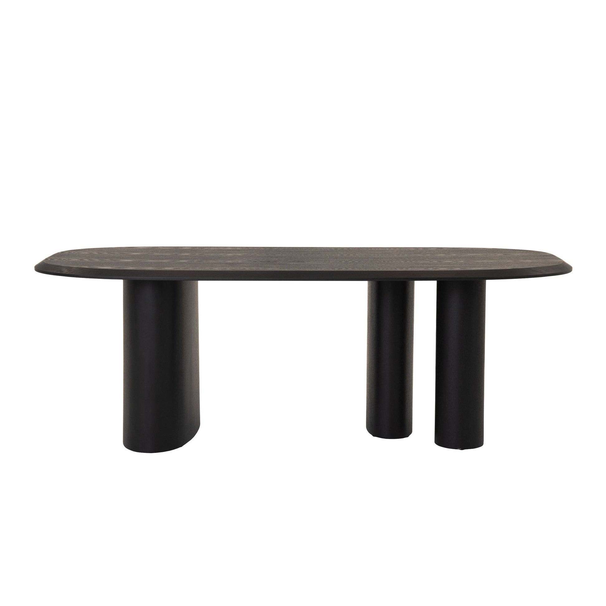 Questo elegante tavolo da pranzo presenta una forma ovale fissa ed è realizzato in impiallacciatura di frassino nero. La sua struttura combina legno massello e lavorato, garantendo durevolezza ed estetica. Il tavolo poggia su gambe a triplo piedistallo, che garantiscono stabilità e un tocco di raffinatezza. Con una generosa lunghezza di 220 cm, può ospitare comodamente fino a 8 persone. È necessario un po' di assemblaggio per installare questo elegante elemento centrale nella vostra sala da pranzo.