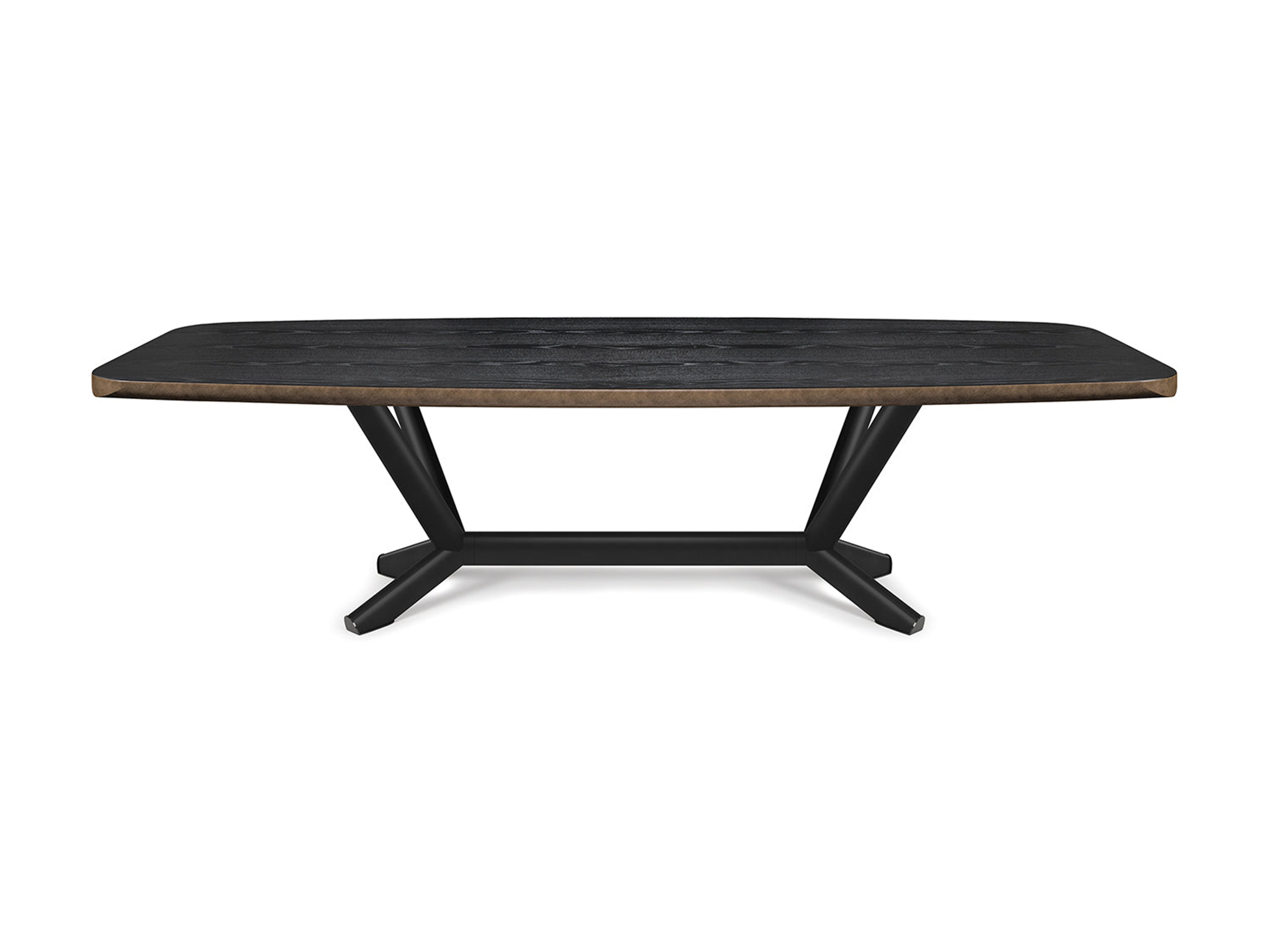 Tavolo con base in acciaio verniciato goffrato titanio (GFM11), bronzo (GFM18), graphite (GFM69) o nero (GFM73), Brushed Bronze o Brushed Grey. Versione 'B': piano a botte con bordi obliqui in noce Canaletto (NC) o rovere bruciato (RB). Versione 'C': piano in noce Canaletto (NC) con profilo inferiore arrotondato laccato Brushed Grey oppure in Olmo laccato nero opaco a poro aperto (OLM73) con profilo inferiore arrotondato laccato Brushed Bronze. Bordi obliqui e arrotondati.