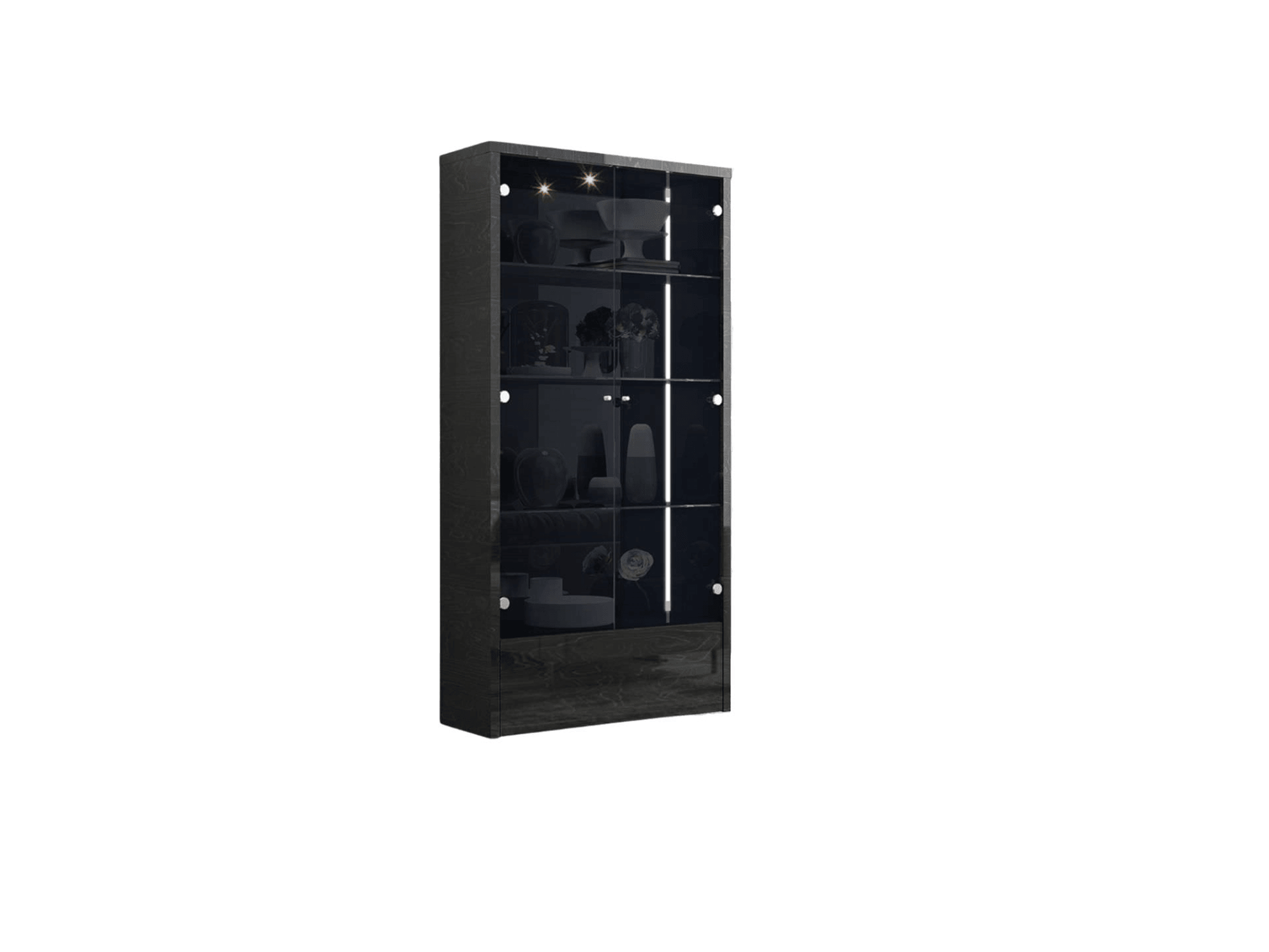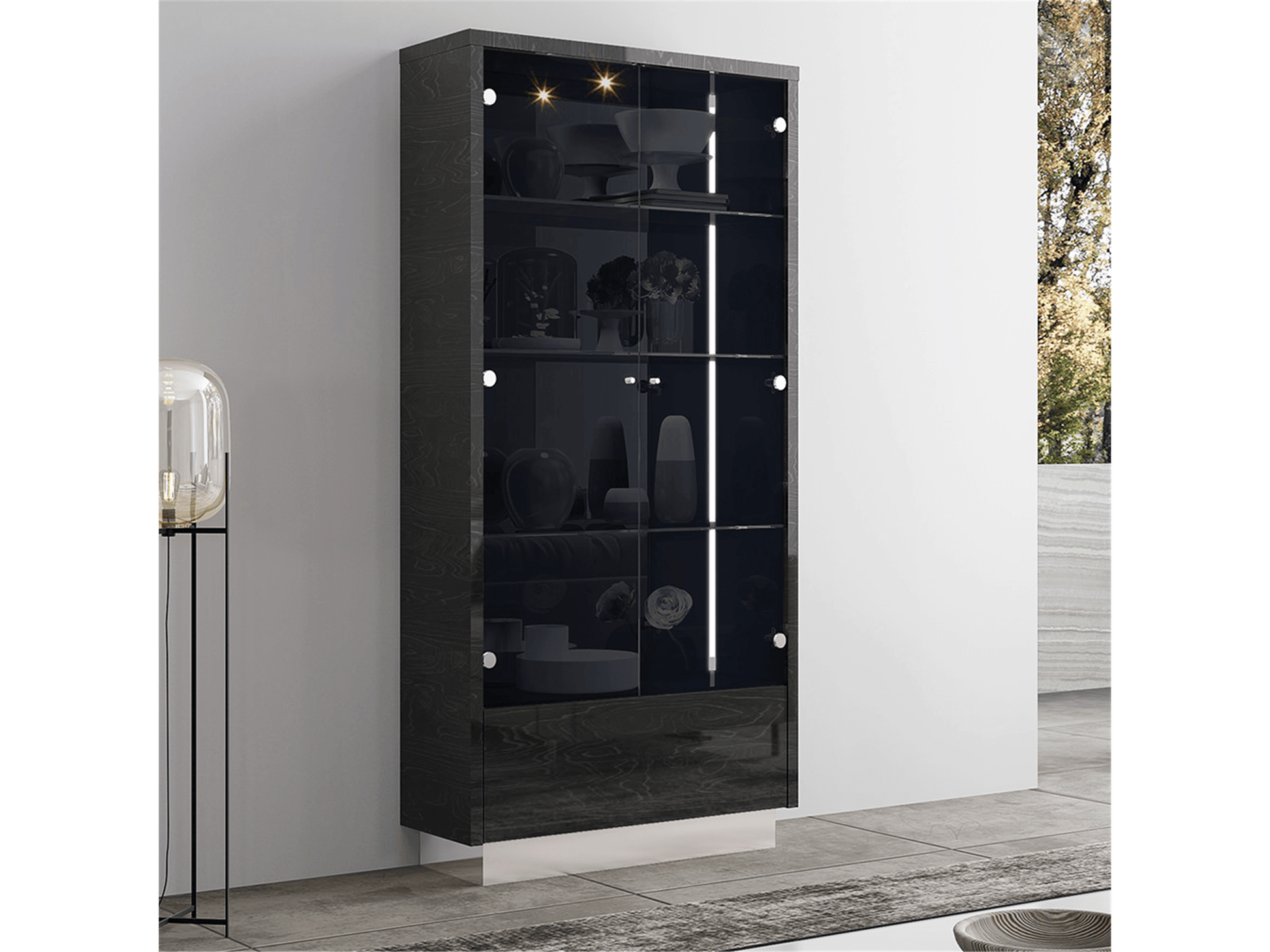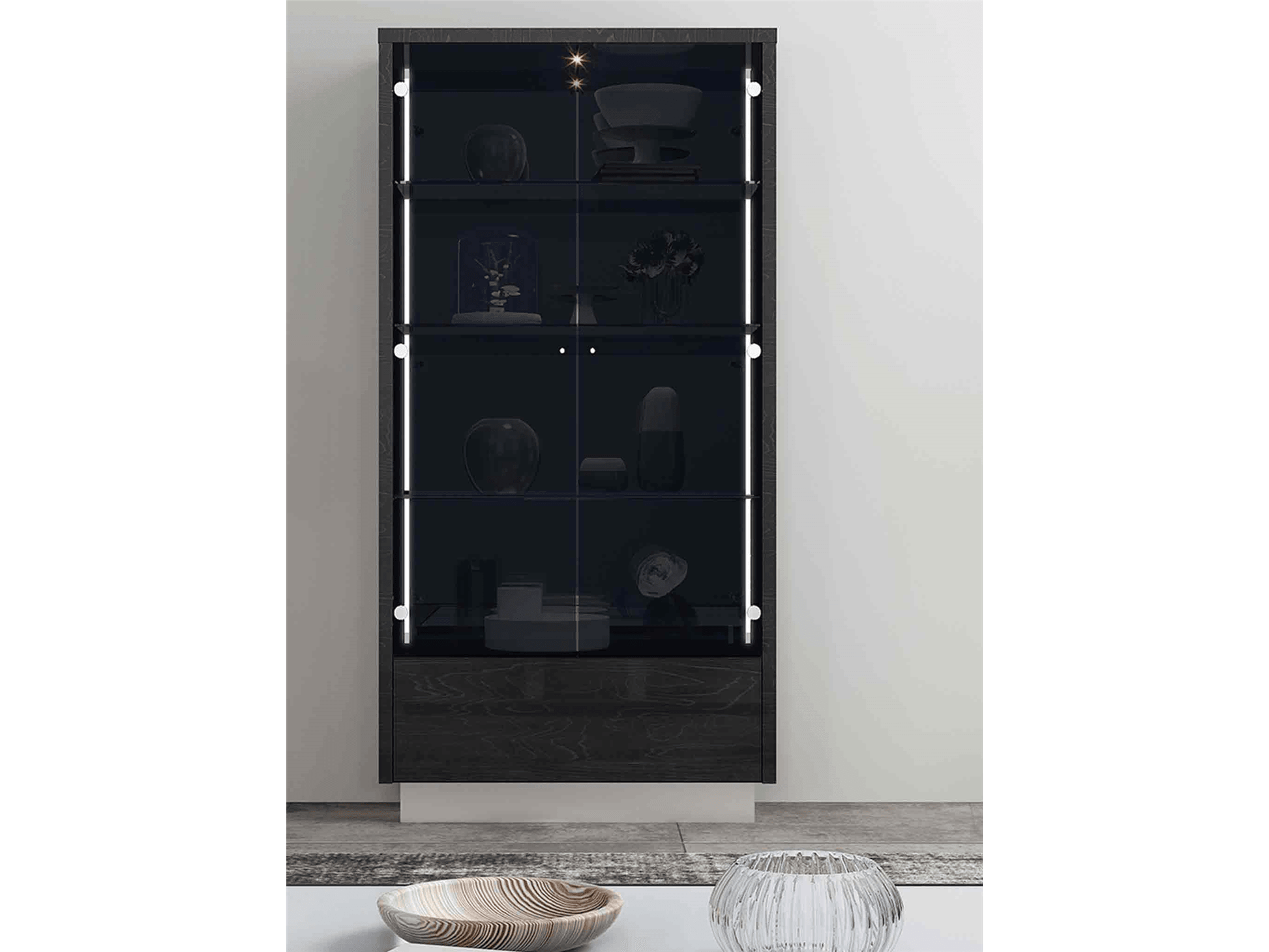 Vetrina Sherlyn grigio lucido, specchio posteriore con luce LED, 3 ripiani in vetro regolabili. 1 cassetto nella parte inferiore con guide a chiusura automatica.