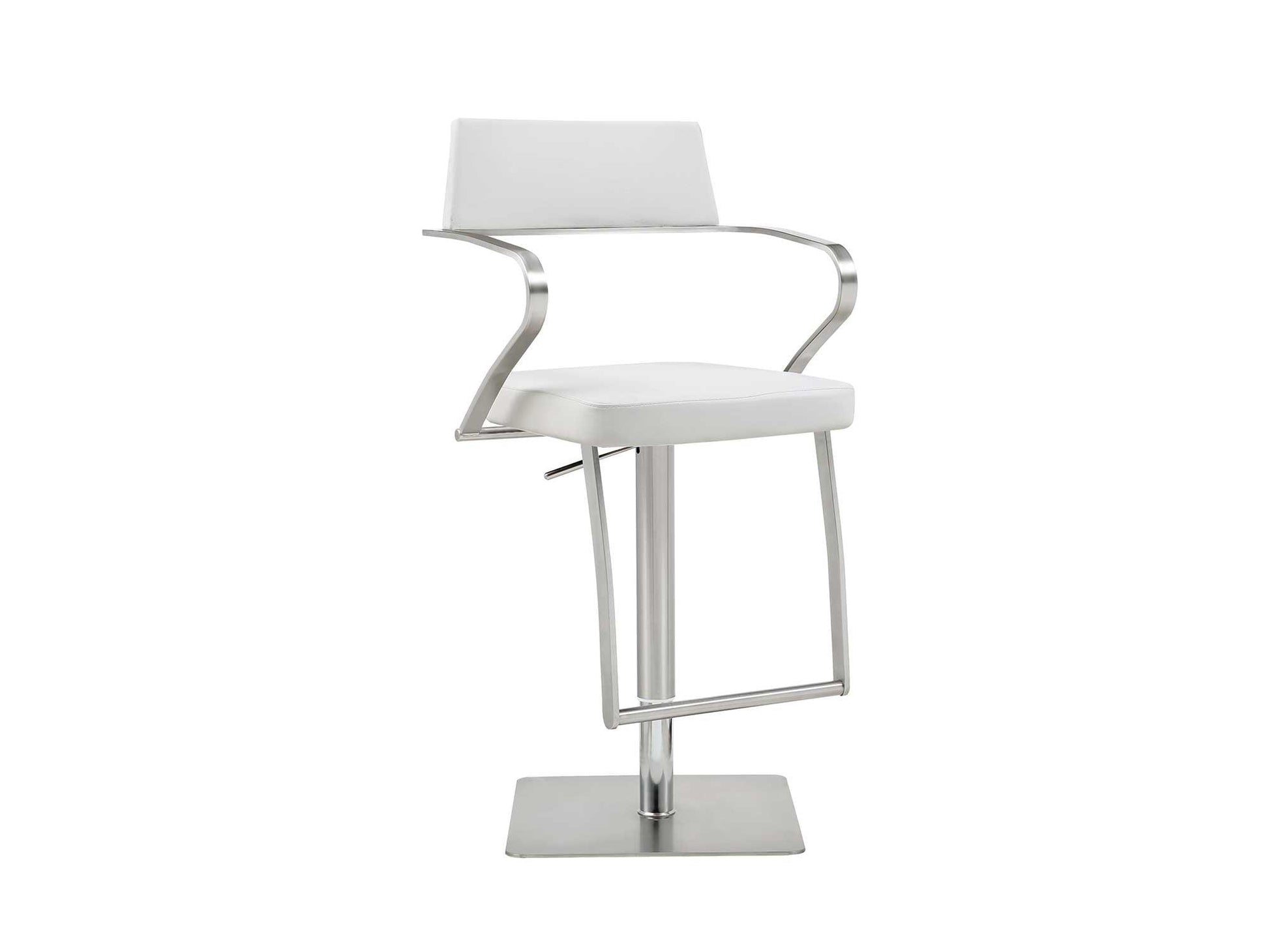 Sgabello da bar Quri, disponibile in similpelle color tortora o in similpelle bianca, altezza regolabile con meccanismo a gas, braccioli e base quadrata in acciaio inossidabile argentato con poggiapiedi lungo.