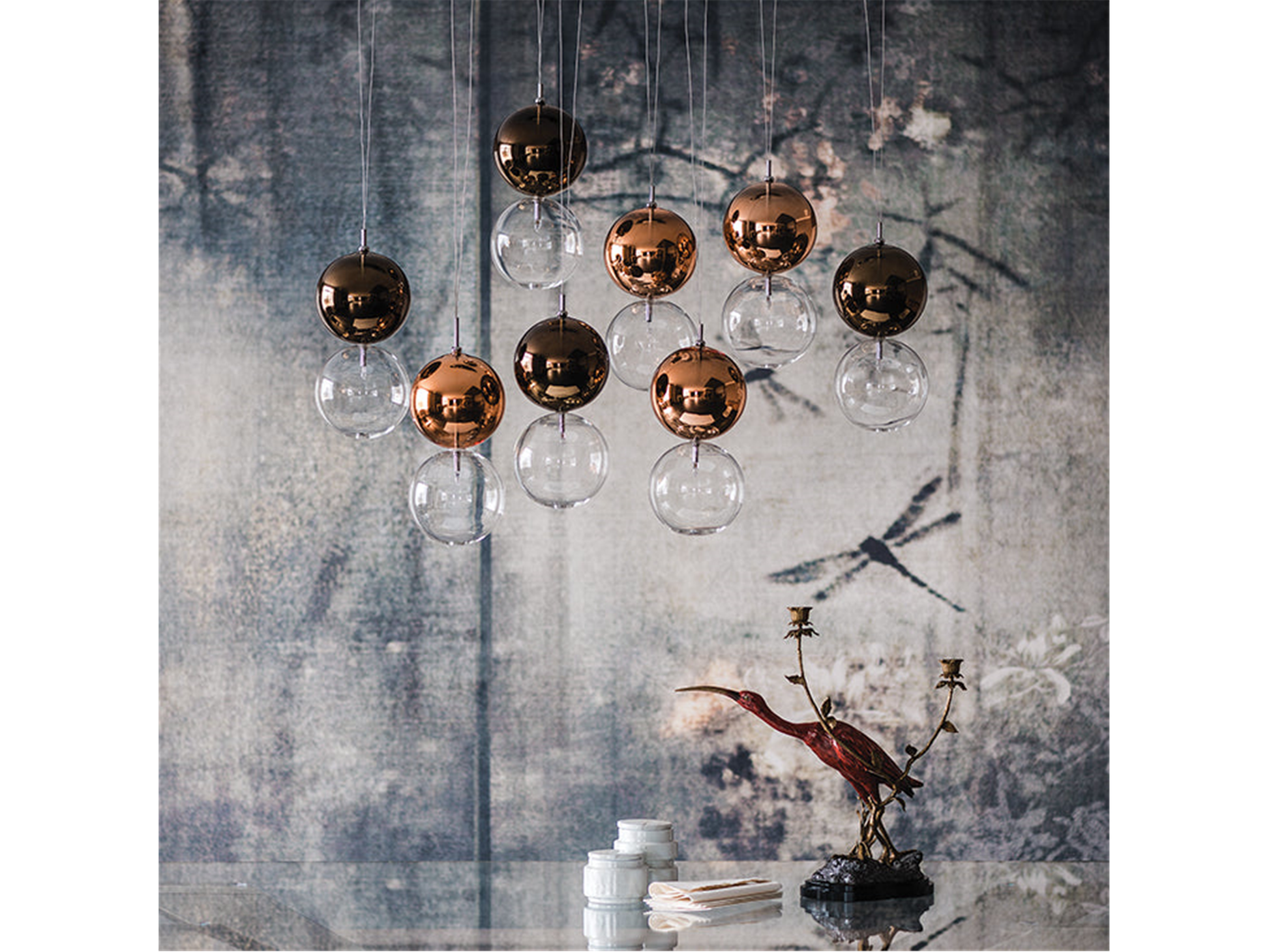 Lampada da soffitto con paralume composto da 2 sfere in vetro borosilicato. Sfera inferiore in vetro trasparente e sfera superiore in vetro trasparente o verniciato cromo, rame, bronzo. Fissaggio a soffitto in acciaio inox. S1: piastra singola. S5: piastra rettangolare per 5 paralumi. S8R: piastra rotonda per 8 paralumi. S8oval: piastra ovale per 8 paralumi. Lampadina inclusa.