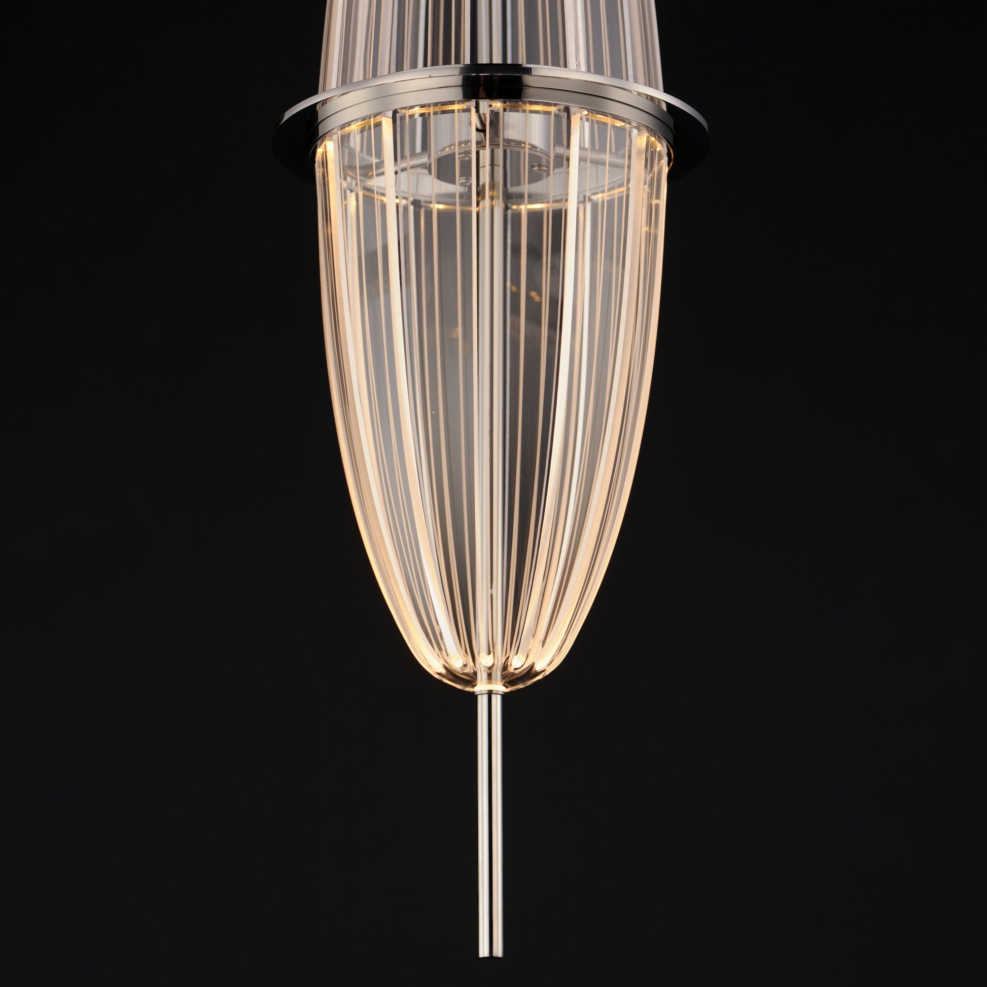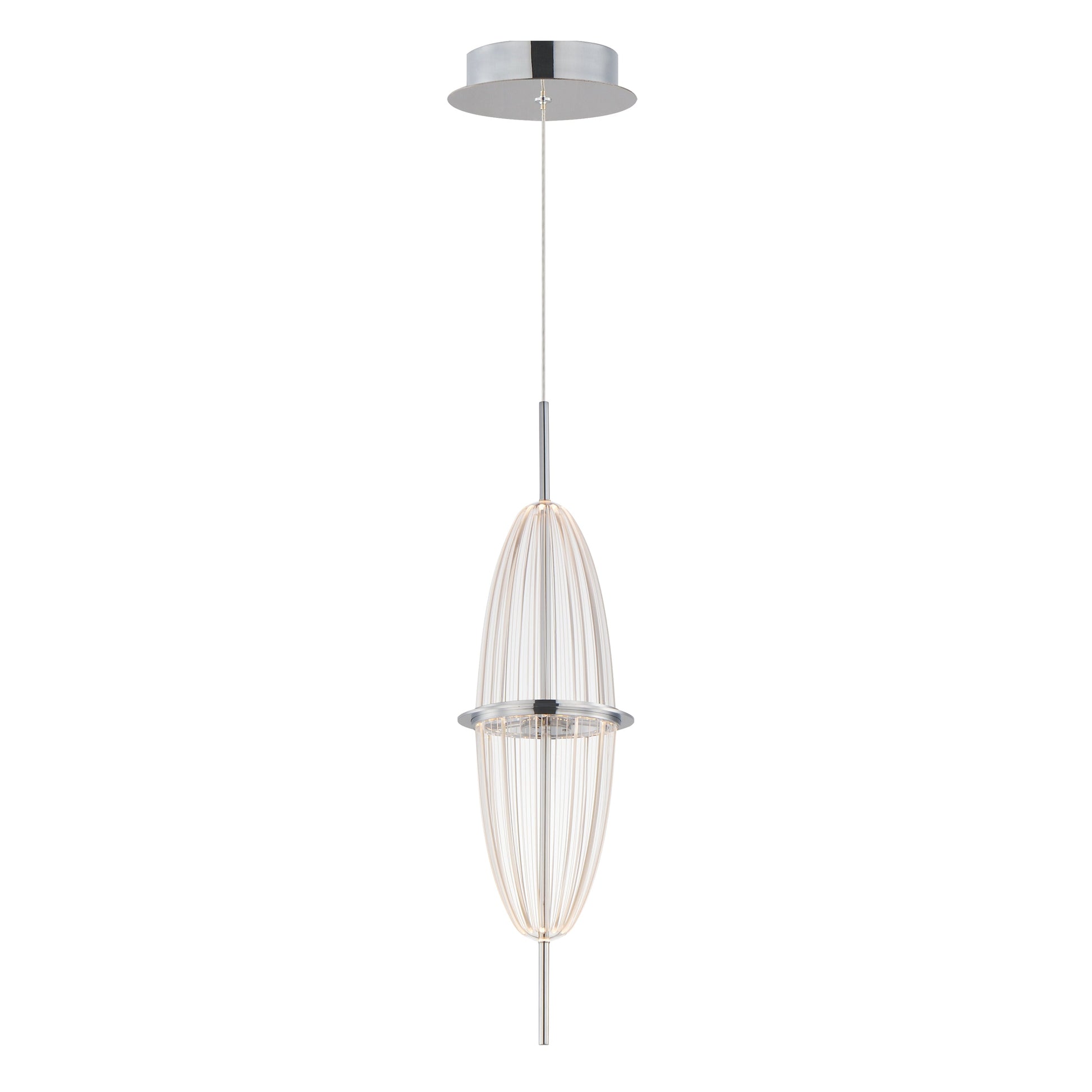 Una combinazione di acciaio inossidabile e acrilico con luce guidata crea forme romboidali allungate, discretamente illuminate da LED. Per i pendenti di dimensioni maggiori è incluso un kit aggiuntivo di cavi aeronautici, che consente di montarli verticalmente o orizzontalmente, con diverse angolazioni. Con finitura cromata lucida, questi pendenti sono fuori dal comune.