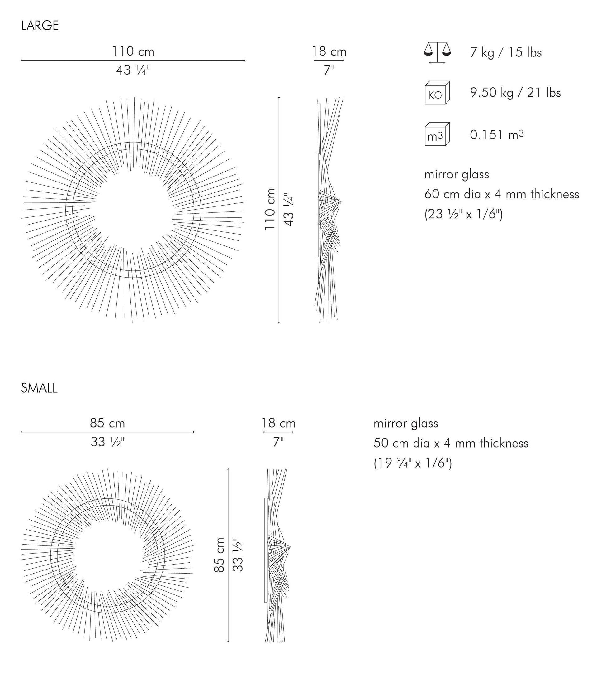 Come i raggi del sole, lo specchio Twiggy è composto da linee sottili che si irradiano dal centro. I raggi di rattan sono intrecciati su una struttura in acciaio, creando un motivo radiale con pendenze dolci.