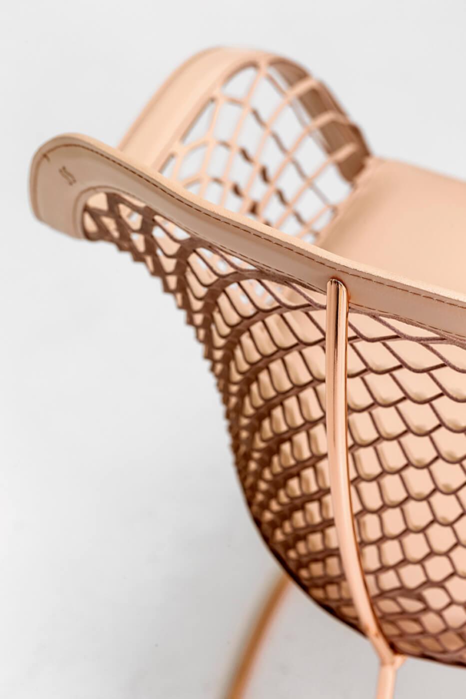 Poltrona con base a slitta. Seduta e schienale sono in cuoio. Il cuoio, elemento naturale, permette di coniugare comfort e resistenza, creando un gioco di luci e ombre in grado di estendere il suo fascino all'ambiente circostante.