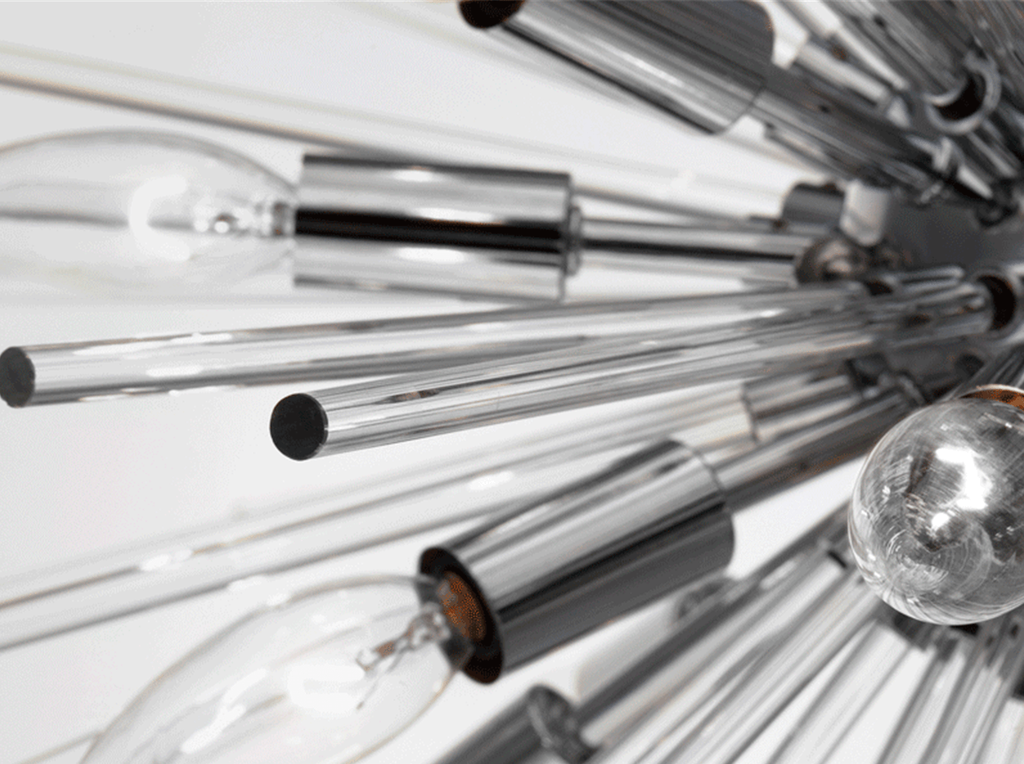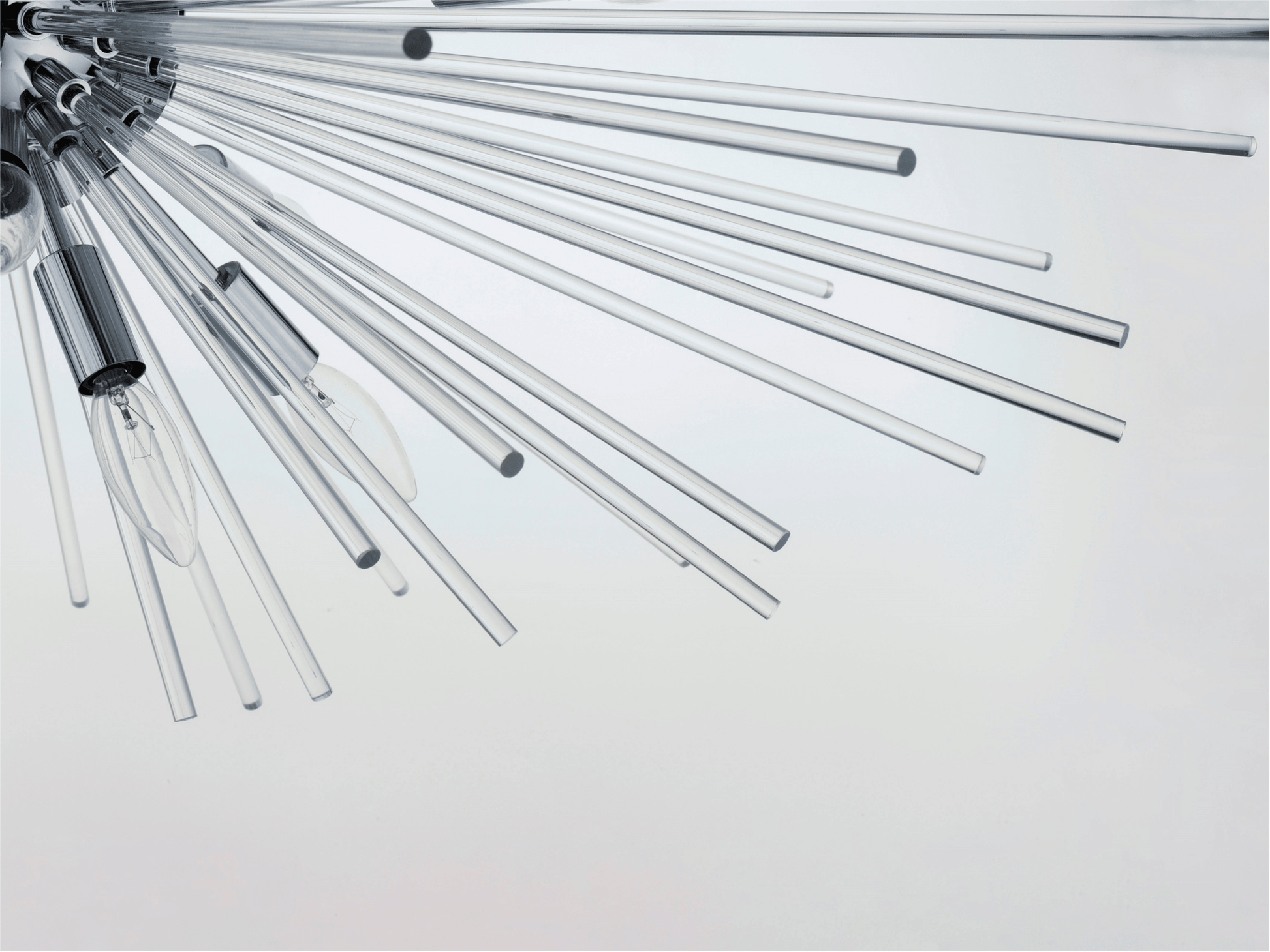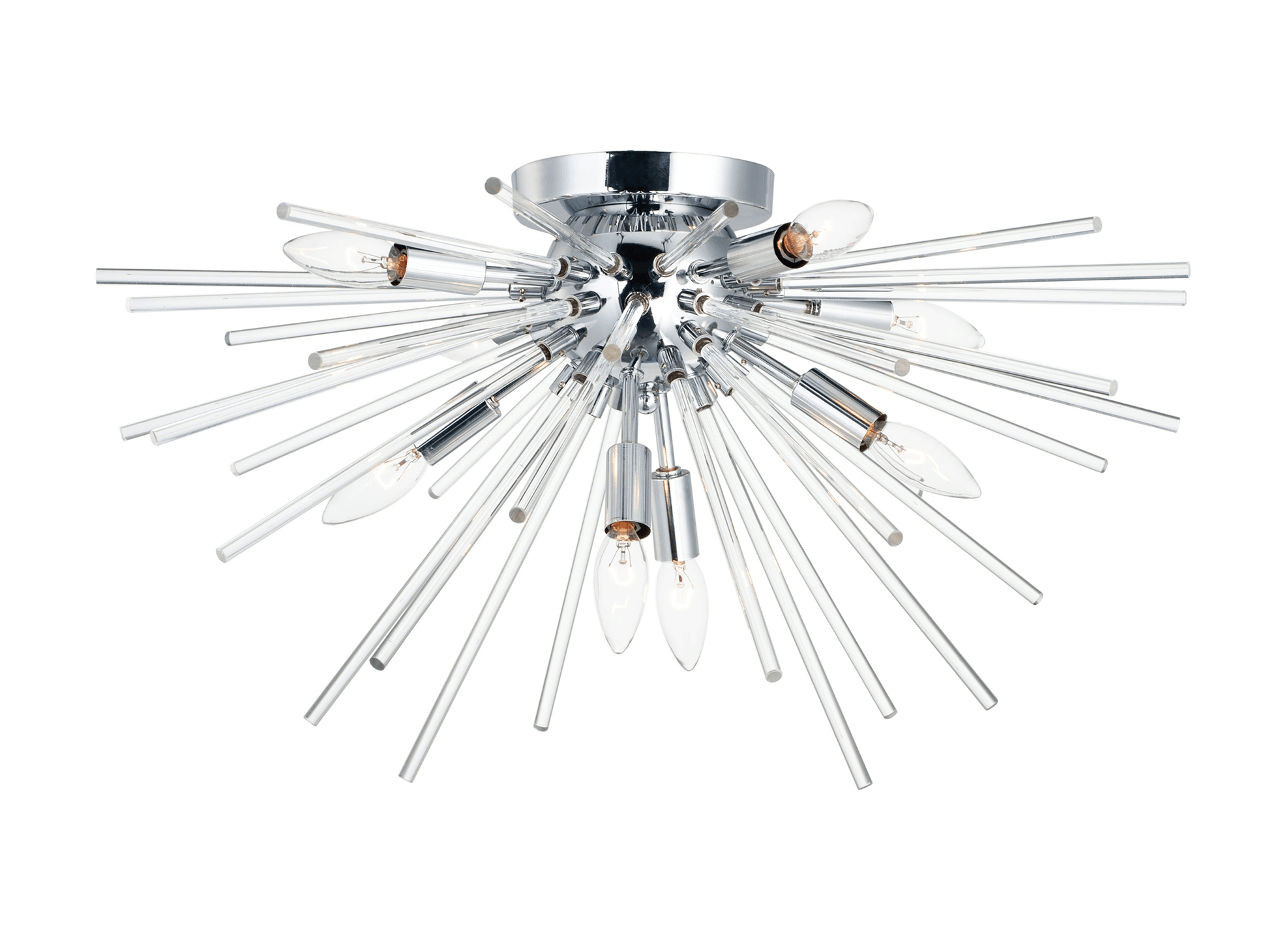 Un'abbagliante esplosione di bacchette di vetro trasparente si estende da una classica forma a Sputnik, rifinita in un brillante cromo lucido o in un caldo ottone satinato. Disponibile in due misure di sospensione e come lampada da soffitto, questo pezzo unico è un pezzo di design progettato per attirare l'attenzione.