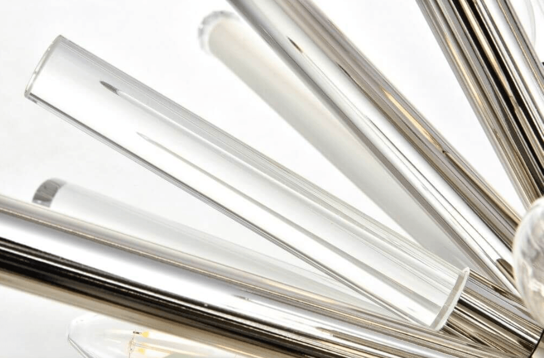 Se desideri un'illuminazione moderna e d'effetto per la tua casa, ma non sei sicuro della forma della lampada, dai un'occhiata alla collezione Maxwell. Caratterizzata da una varietà di stili rettangolari, rotondi e a raggiera, questa lampada include aste metalliche con sfere di cristallo alle estremità, intervallate da aste in vetro trasparente, che si fondono per creare effetti visivi di grande impatto.