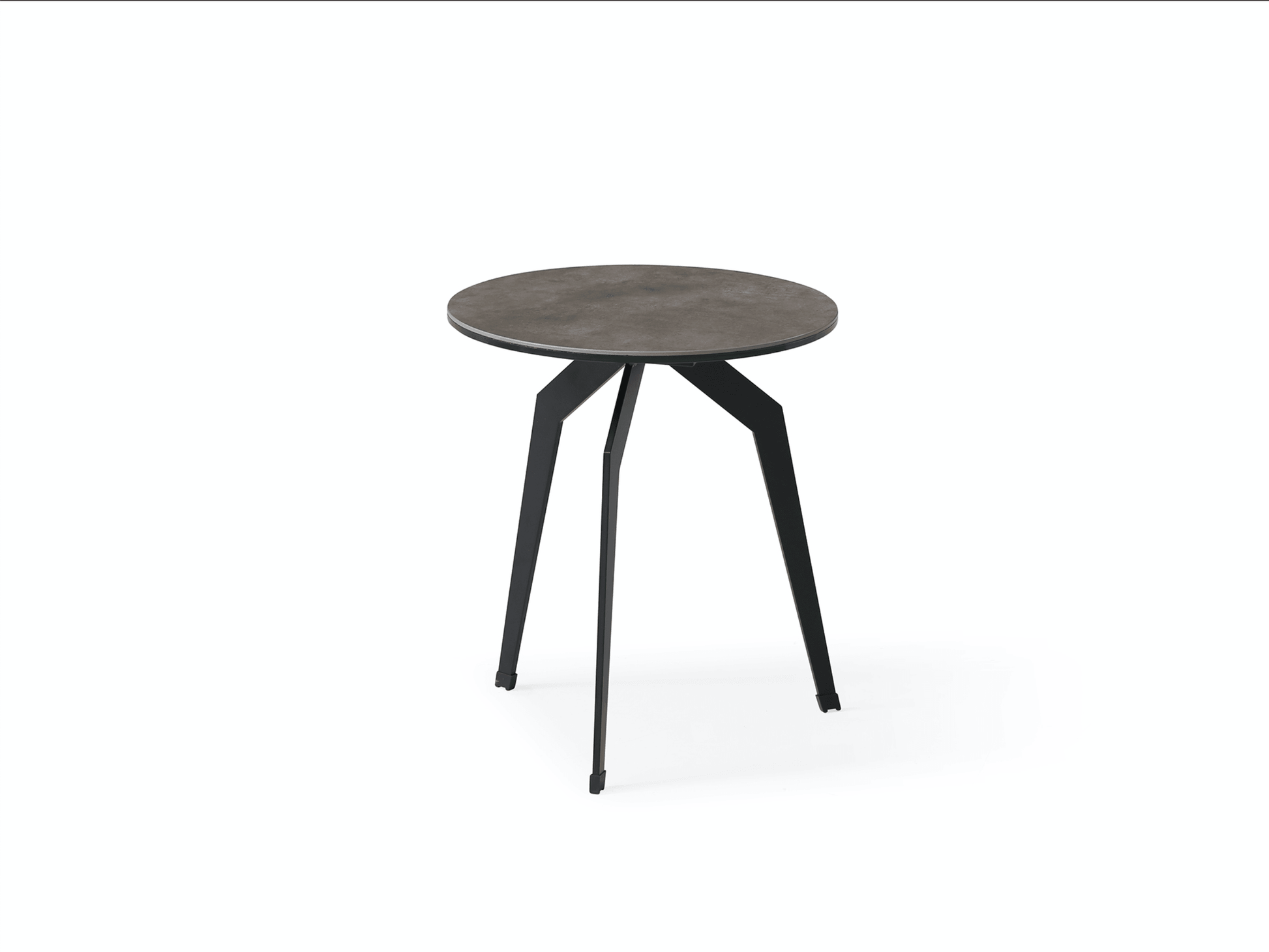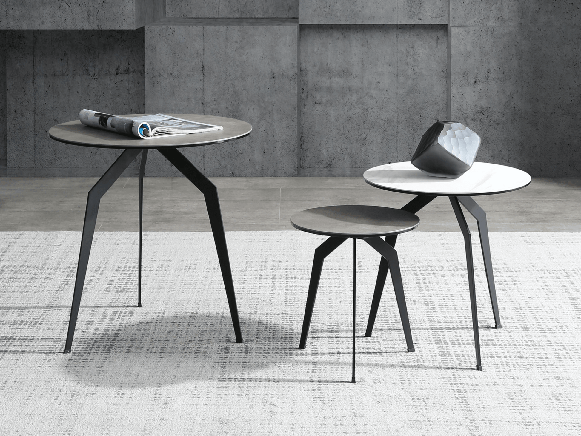Tavolino Santana, piano in vetro da 6 mm + piano in ceramica da 3 mm (500, 400 e 300), base in ferro verniciato a polvere nero opaco.