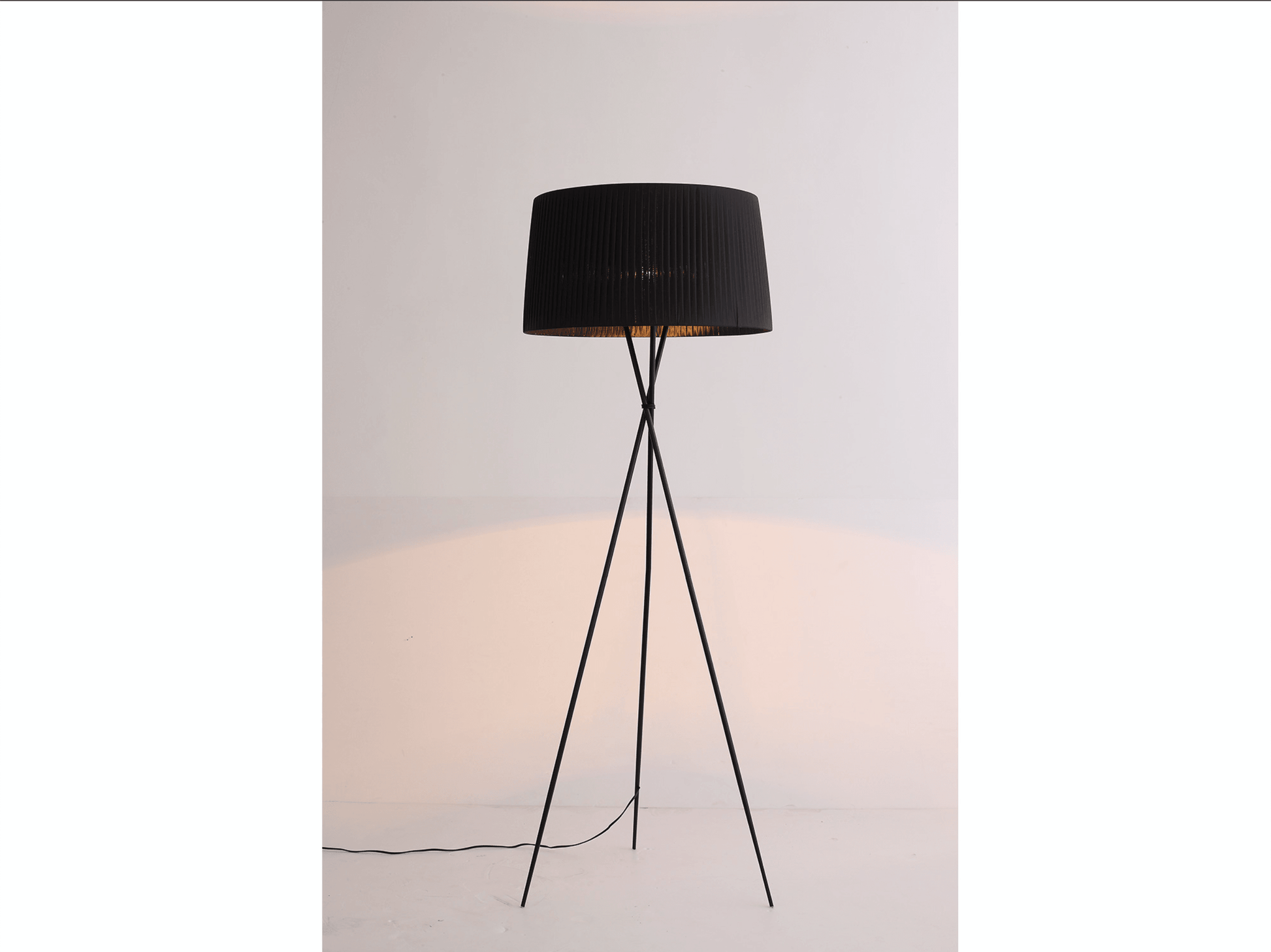 Base in acciaio al carbonio. Paralume in tessuto rosso o nero.