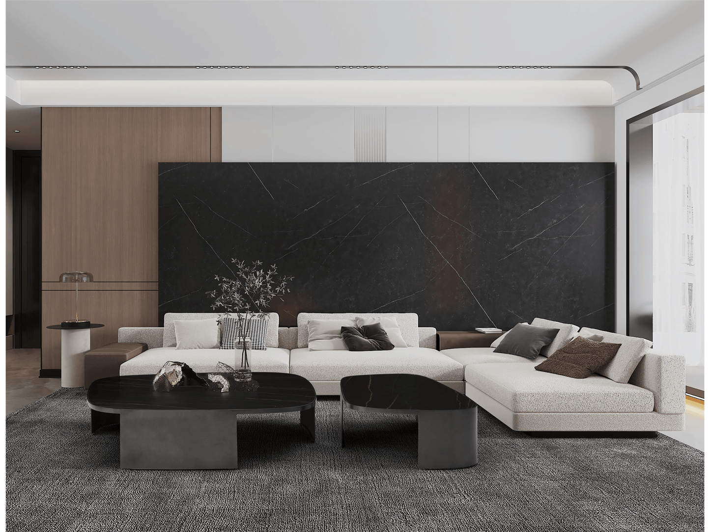 Tavolino da caffè Amaya piccolo o grande, con piano in ceramica nera e oro e base in metallo grigio massiccio.