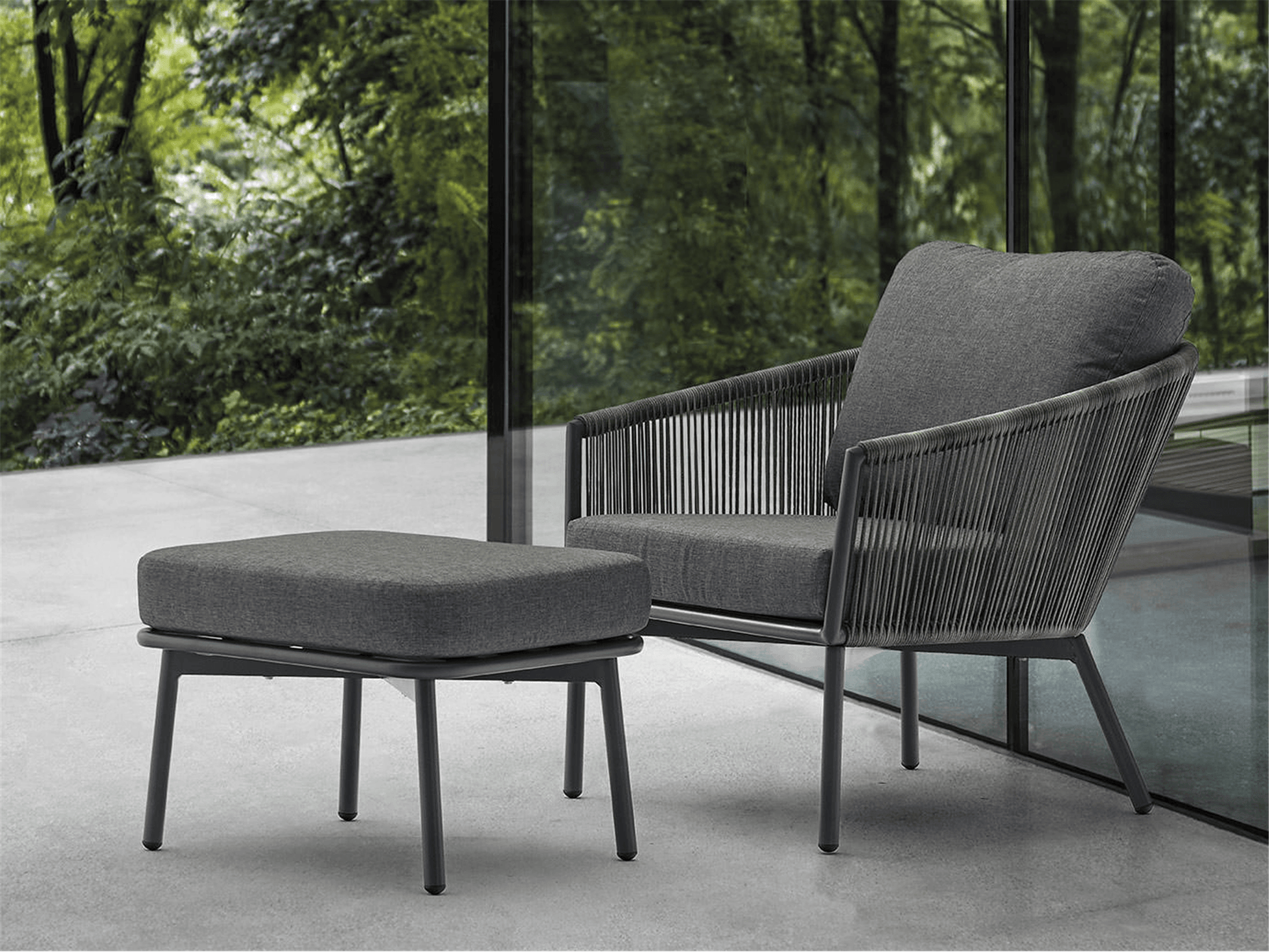 Sedia e pouf Yarro in vimini grigio scuro e gambe verniciate a polvere grigio metallo.