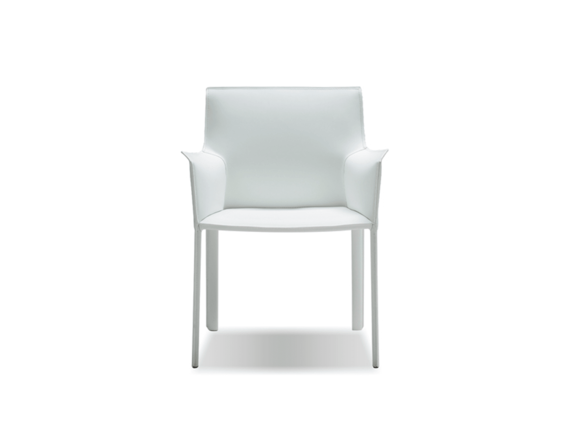 La collezione Flare è realizzata con una solida struttura in acciaio e sedute in compensato curvato, ed è accuratamente rivestita e rivestita completamente in pelle rigenerata. Questa finitura opaca, disponibile in cinque colori, vanta una finitura antigraffio, facile da pulire e mantenere. Un semplice dettaglio di impuntura unisce tutta la pelle e una robusta bordatura copre tutte le cuciture a vista. Lo schienale ha una finitura simile a quella di un'imbracatura che si adatta alla schiena di ogni utente per offrire il massimo comfort durante i pasti.