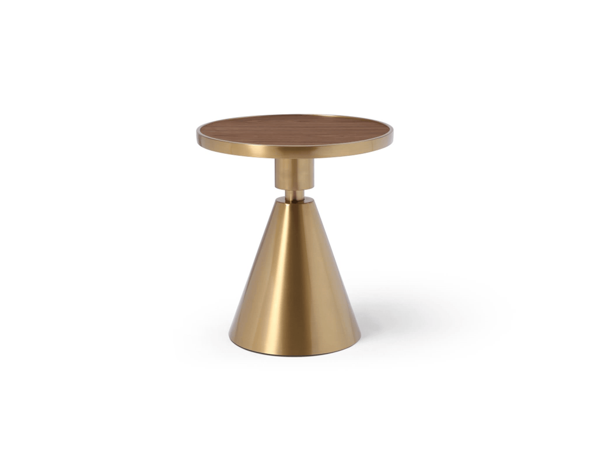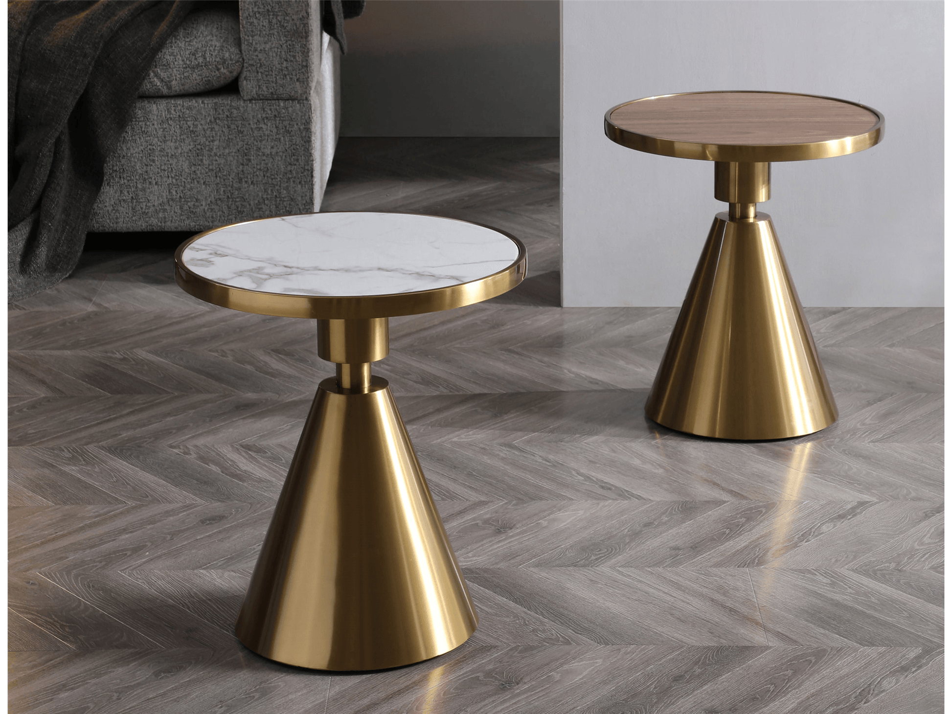 Il tavolino Hurst è disponibile con piano in marmo bianco o impiallacciato in noce, struttura dorata e base in acciaio inossidabile dorato.
