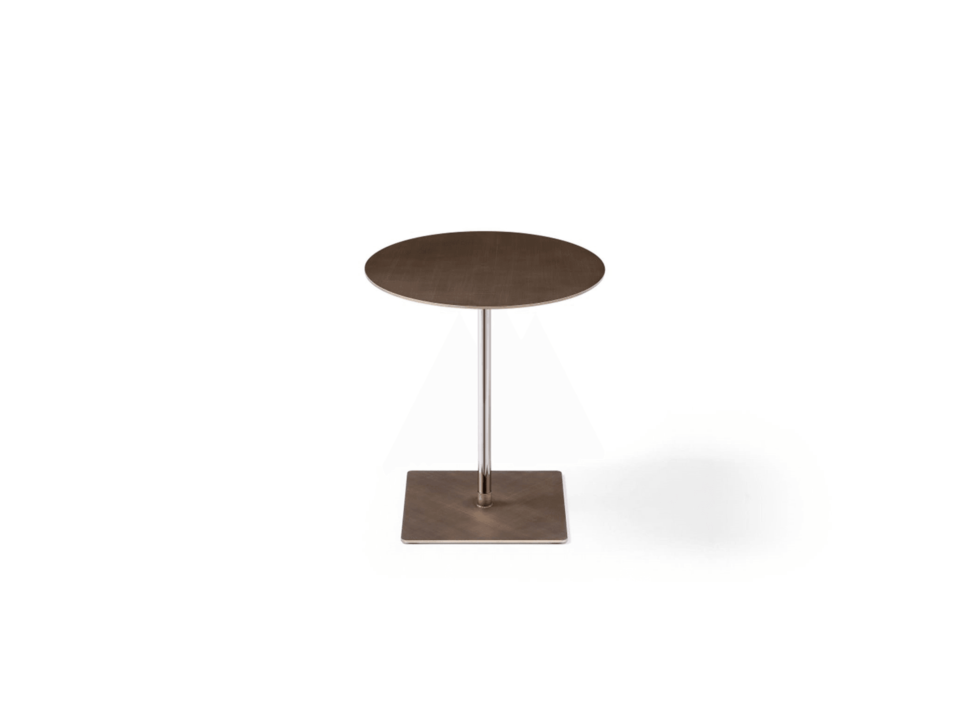 Il tavolino rotondo Kolby è realizzato in metallo spazzolato bronzo, con piano a griglia e base in acciaio inox. L'altezza è regolabile.