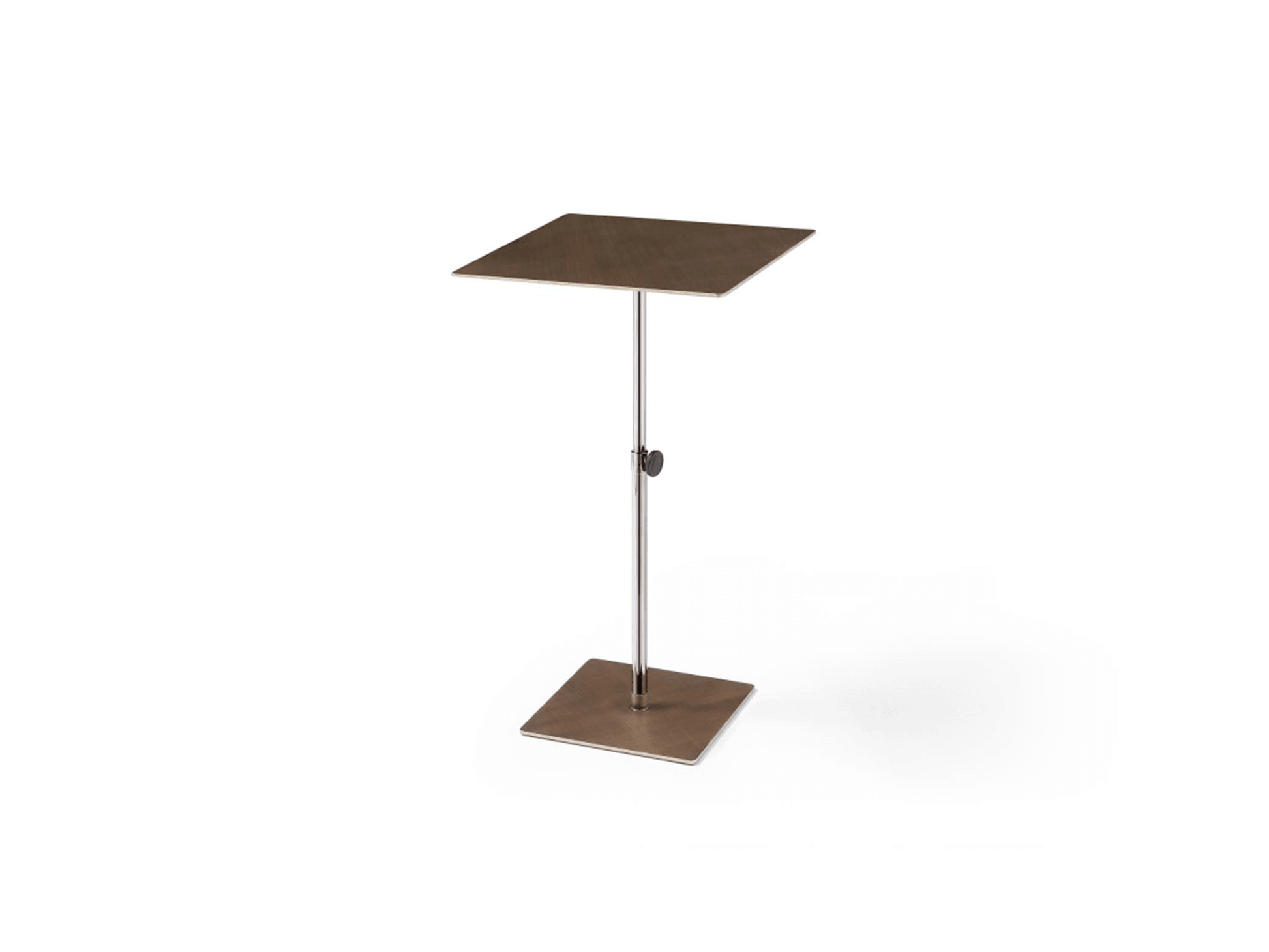 Il tavolino quadrato Kolby è realizzato in metallo spazzolato bronzo, con piano a griglia e base in acciaio inox. L'altezza è regolabile.