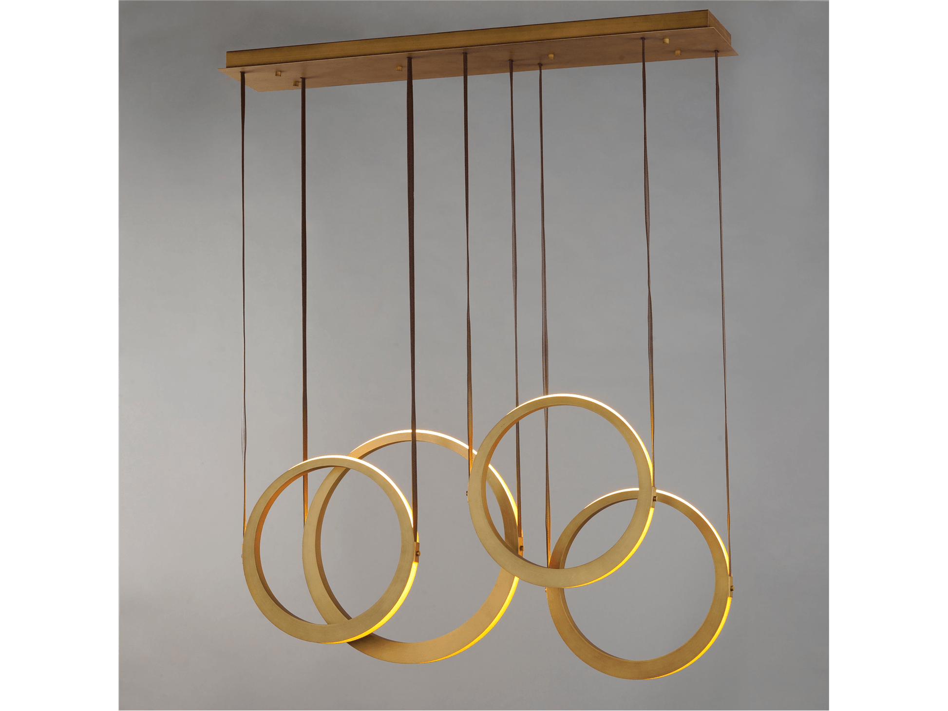 Anelli affusolati in ottone anticato sono sospesi da cinghie di cuoio in questo giocoso design. All'interno di questi anelli, sorgenti luminose a LED nascoste forniscono luce indiretta. Questa luce proietta la luce sugli anelli adiacenti, illuminando contemporaneamente l'area sopra e sotto l'apparecchio. Adatto sia ad ambienti moderni che di transizione.