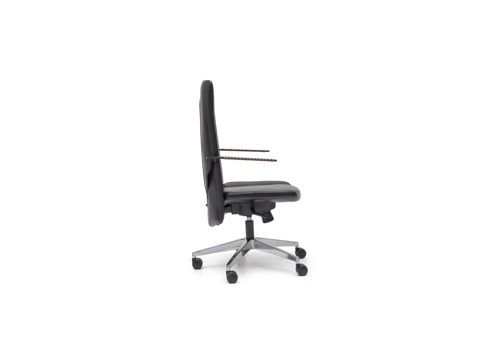 La poltrona girevole direzionale Path con schienale alto è elegante e confortevole. I braccioli sono rivestiti in pelle color cognac per un look e una sensazione più sofisticati.