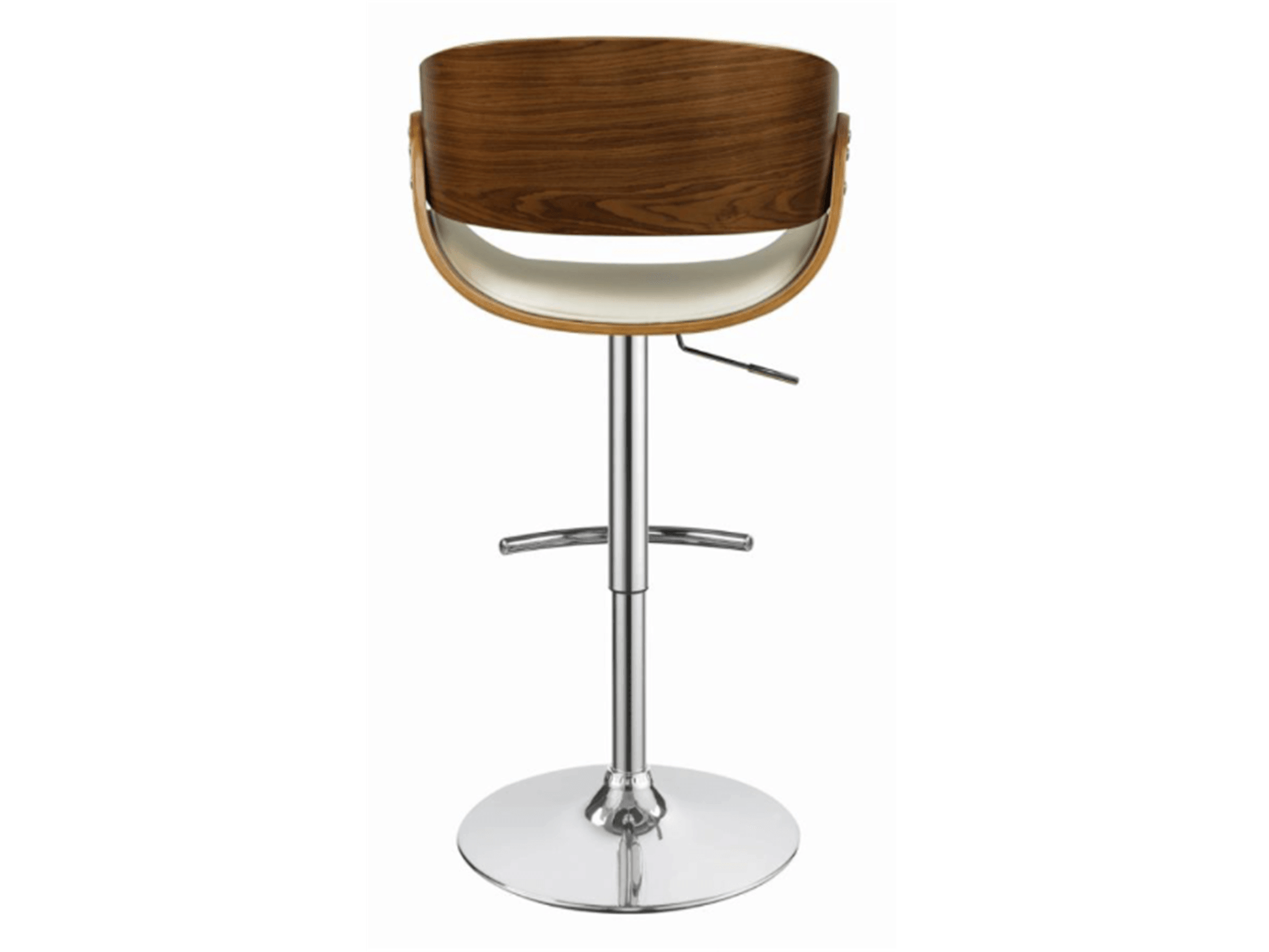 Lo sgabello da bar Vanta è caratterizzato da uno schienale in noce con rivestimento in similpelle bianco sporco per un comfort extra e base regolabile.